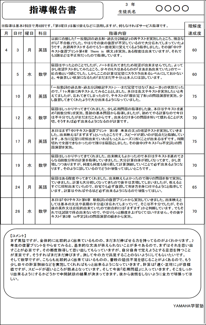 当塾では下記のような報告書を毎月作成してお渡ししています。